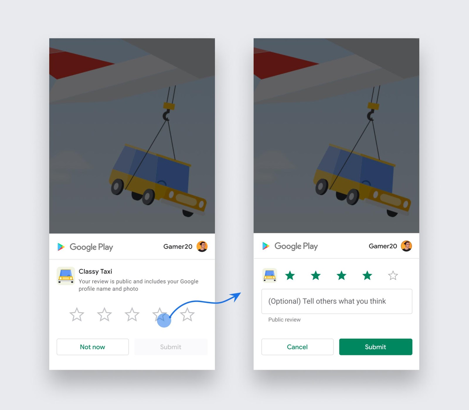 Ratings and reviews provide an important channel for communication between you and your app users. Google Play has recently introduced a native prompt, similar to the Review Request feature on the App Store.