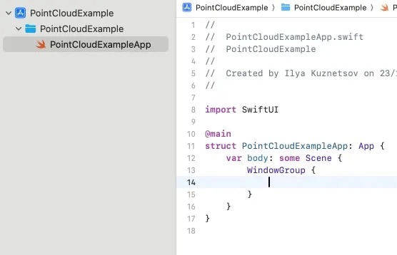 In PointCloudExampleApp.swift, create an ARManager state object and present the AR view to SwiftUI: