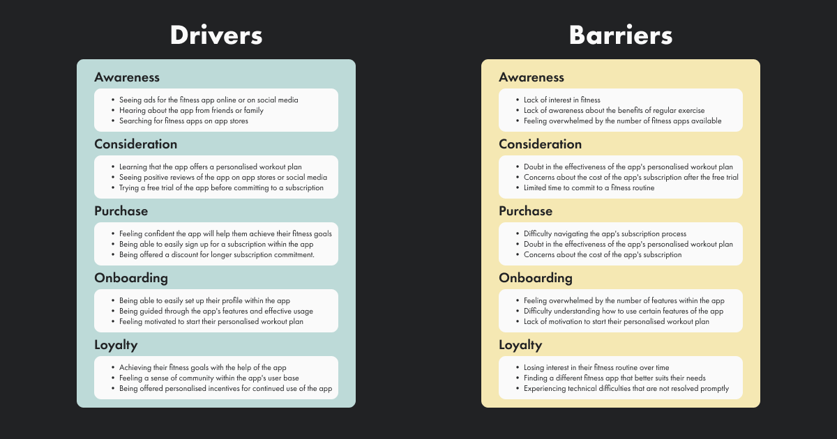Barriers are obstacles that prevent a customer from taking action, such as lack of information, complicated processes, or negative experiences. These may be external barriers, such as competition or market conditions, or internal barriers, such as lack of resources or expertise.