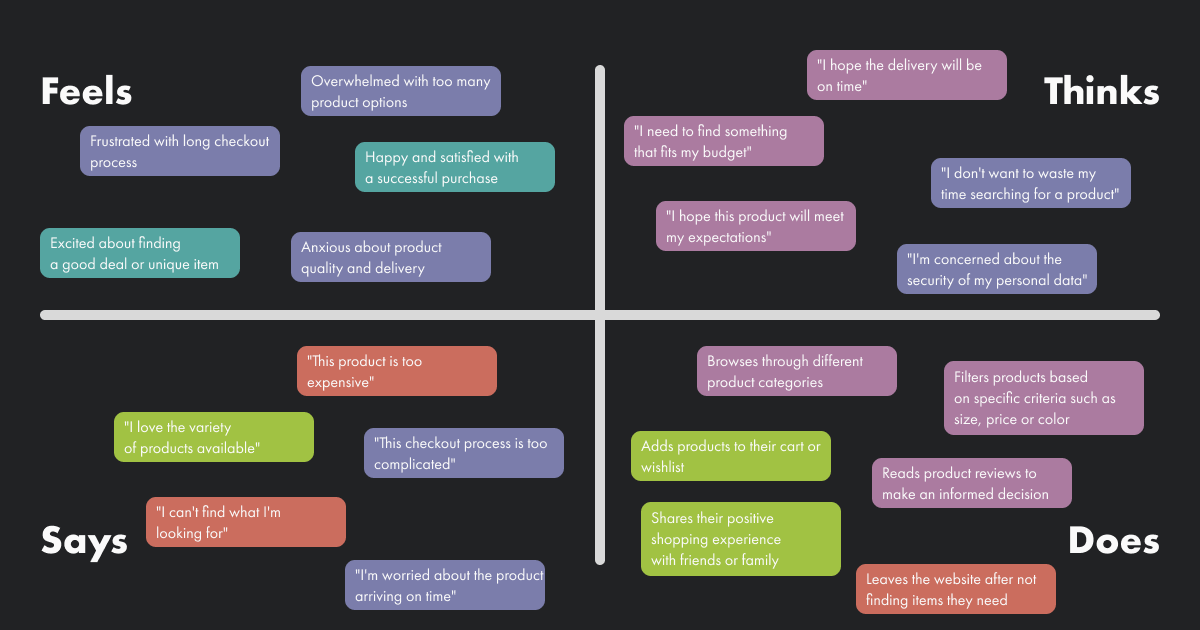 - What a customer says: This quadrant includes the words and phrases that a customer uses to describe their experience, as well as any feedback or complaints they may have.